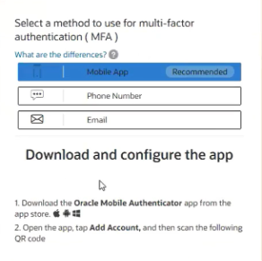 - Follow the on-screen guide to choose your preferred MFA method (Oracle Mobile Authenticator, Mobile SMS or email ID-based One-Time Password), enter details, and verify your code.