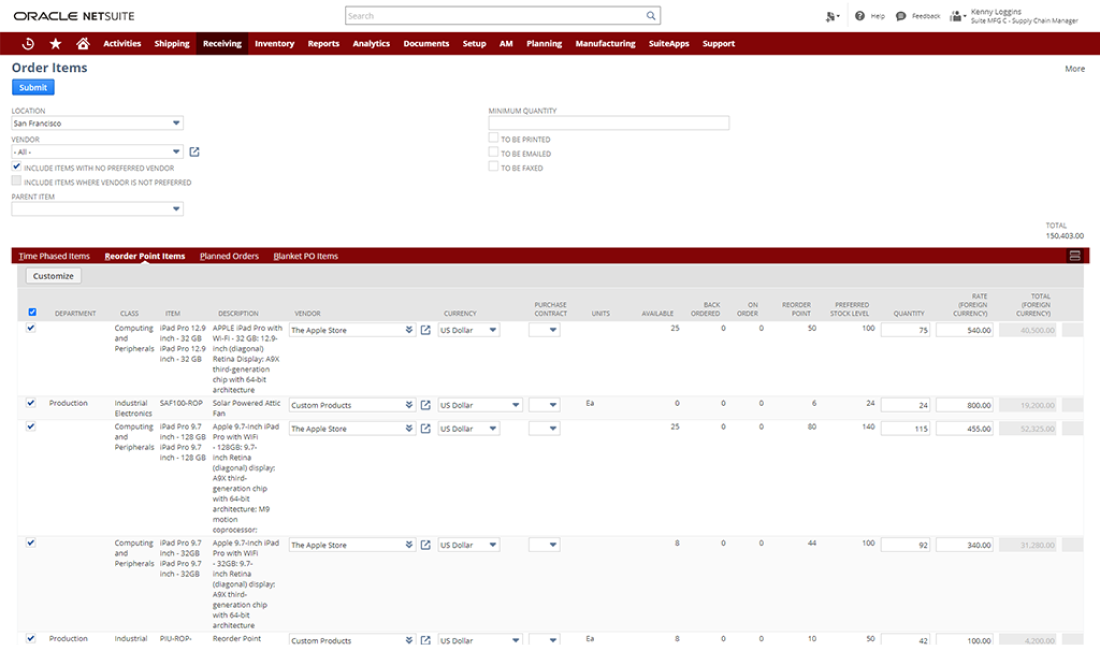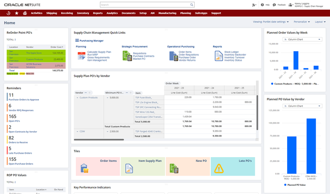 NetSuite supply chain planning helps businesses balance supply and demand with the right combination of cost controls, lead times and service levels. Using inventory management and demand planning techniques, combined with a robust scheduling engine and predictive analytics, NetSuite supply chain planning enables businesses to make informed decisions that ensure product availability while keeping excess inventory to a minimum.