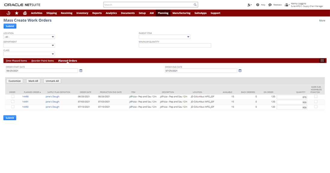 NetSuite supply planning capabilities are available within the NetSuite Demand Planning and Advanced Manufacturing add-on modules.
