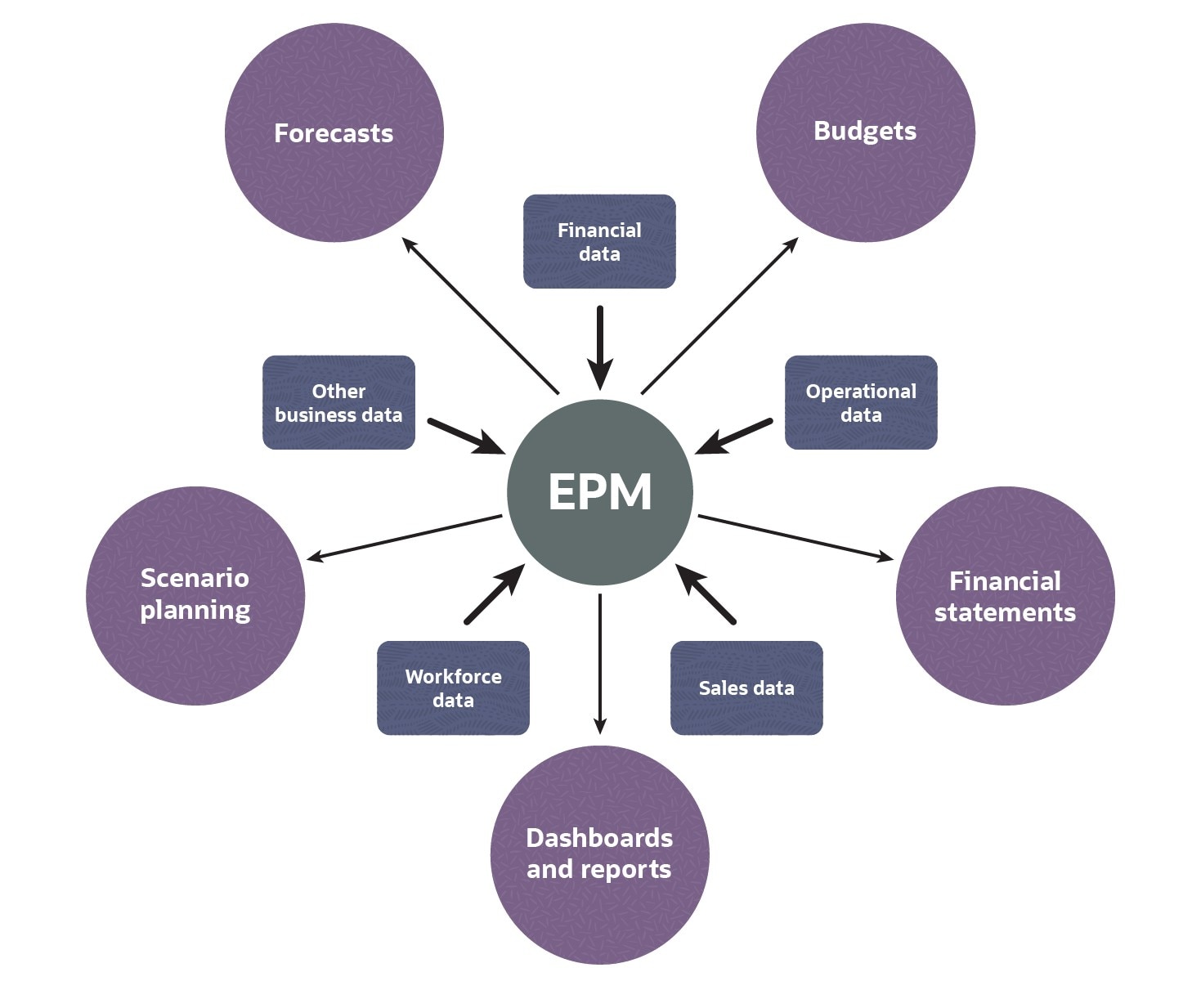 - EPM connects planning, budgeting, forecasting and reporting so changes in one area flow through to others automatically.